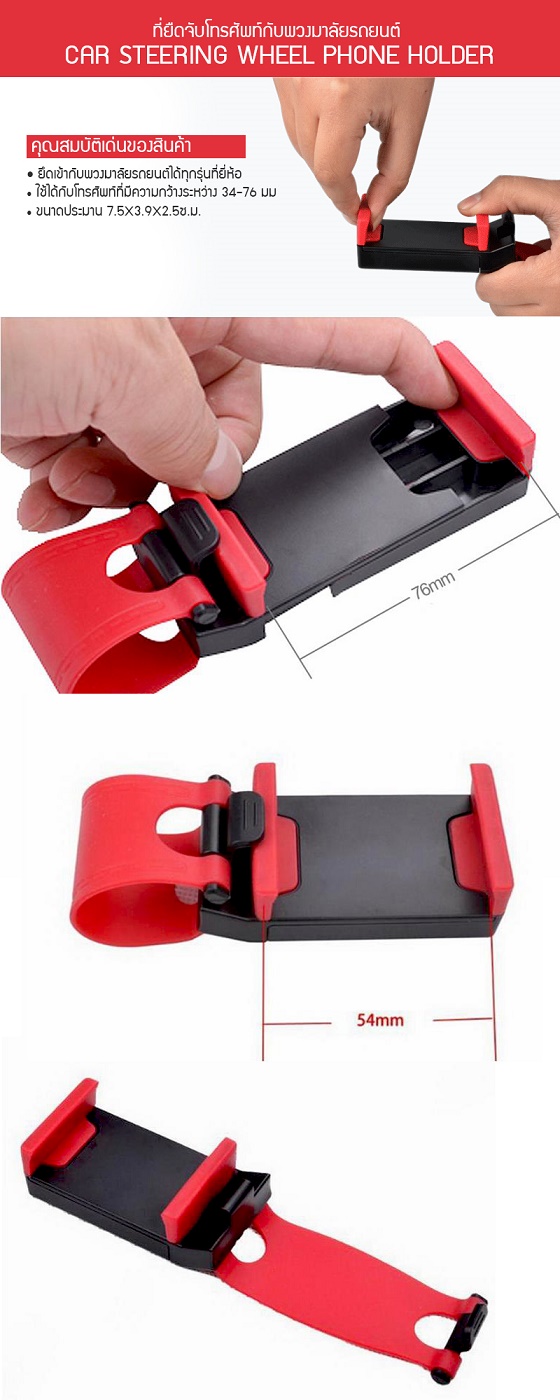 ที่ยืดจับโทรศัพท์กับพวงมาลัยรถยนต์ สำหรับยึด Smart Phone ติดเข้ากับพวงมาลัย สำหรับดูแผนที่จาก GPS, สนทนาโทรศัพท์, ฟังเพลง ฯลฯ ใช้ได้กับพวงมาลัยรถทุกรุ่นตัวจับโทรศัพท์ยืดได้กว้างสุด 76mm ใช้ได้กับโทรศัพท์ที่มีความกว้างระหว่าง 34-76 มม เช่น รุ่น iPhone 5/5S/4/4S,Galaxy Note 3/2/1, S5/S4/S3, Grand 1/Grand2 เป็นต้นติดตั้งง่ายดายใช้เวลาเพียงไม่กี่วินาที ตัวยางรัดยืดหยุ่นดีเยี่ยม ใช้ได้กับรถยนต์ทุกรุ่น ไม่ทำให้เกิดรอย